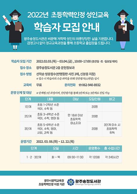 광주송정도서관이 ‘2022학년도 초등학력인정 성인교육’ 학습자를 모집한다고 2일 밝혔다.