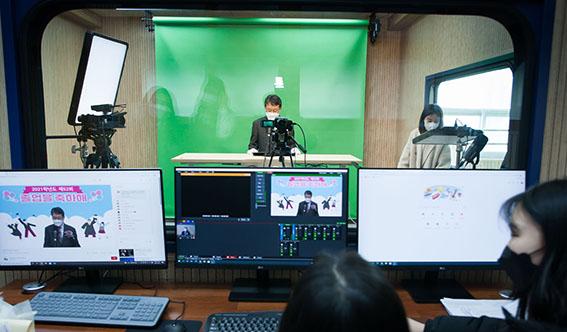 졸업식은 신설학과인 ‘콘텐츠창업과’의 실습실을 활용해 유튜브 실시간 스트리밍 방법으로 진행했다. 지난 3년동안 학업에 전념해 교육과정을 모두 수료한 졸업생들과 재학생은 교실에서, 부모님과 가족들은 가정에서 졸업식을 실시간으로 시청했다.