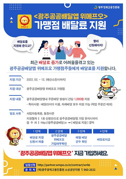 대상은 광주공공배달앱에 입점하고 배달료 지원을 신청한 소상공인으로 광주공공배달앱에서 발생한 배달주문 1건당 1000원씩 월별 정산해 다음달에 가맹점주에게 지급하는 방식으로, 예산이 소진될 때까지 가맹점주 1인당 최대 50만원을 지원한다.