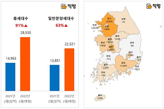 전년 동월 대비 2022년 2월 전국 아파트 분양물량 비교(좌) 및 시도별 세대수 증감(우). (자료=직방 제공)