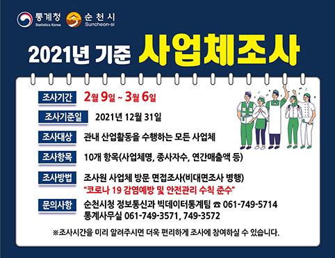 순천시는 9일부터 3월 6일까지 ‘2021년 기준 사업체조사’를 실시한다.