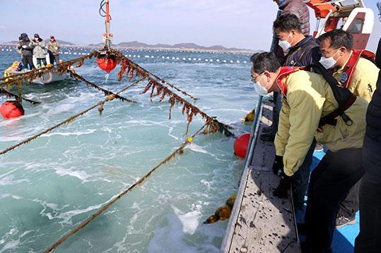 명현관 전남 해남군수가 8일 황백화 피해가 발생한 다시마 양식장을 방문해 피해상황을 점검하고 있다. (사진=해남군 제공0 2022.02.08.