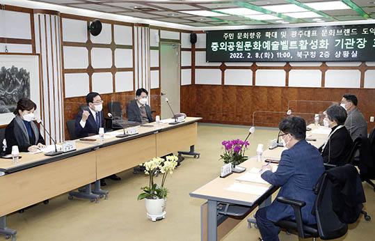 북구는 이날 오전 11시 구청 상황실에서 회의를 열고 5개 문화예술 기관장과 함께 '중외공원 문화예술벨트' 활성화 방안을 논의했다. 회의에는 문인 북구청장과 국립광주박물관장, 시립미술관장, 문화예술회관장, 역사민속박물관장, (재)광주비엔날레 대표이사 등이 참석했다.