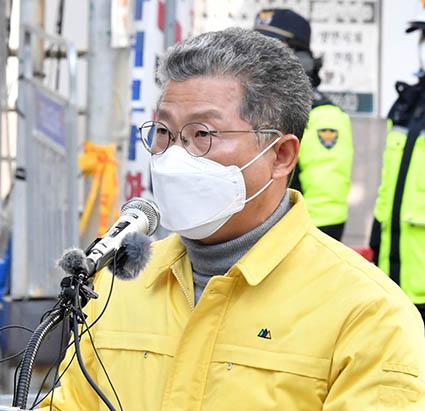서대석 광주 서구청장이 9일 오전 HDC 신축 아파트 붕괴 현장에서 사고 피해자 장례 지원·피해 보상 절차 등에 대해 설명하고 있다. 2022.02.09.