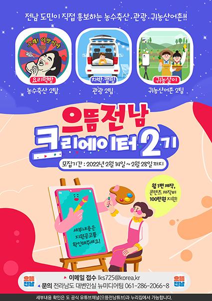 전남에 주소를 둔 도민 중 영상 제작이 가능한 팀(팀 또는 개인)이면 누구나 지원할 수 있다. 전남도는 최종 6팀(개인)을 선발해, 3월17일 결과를 발표할 예정이다.