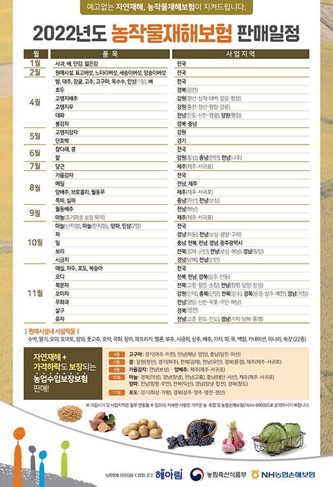 현재 판매 중인 사과, 배, 단감, 떫은감(적과전종합위험Ⅱ) 보험은 3월 4일까지만 판매되며, 농업용 시설과 딸기, 오이, 토마토 등 시설작물에 대한 보험은 이달 말부터 판매를 시작한다.