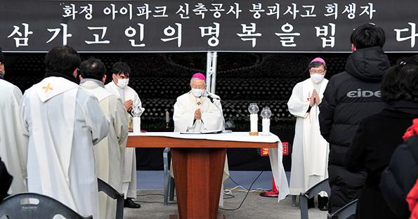 천주교광주대교구가 광주 서구 아파트 붕괴사고 현장을 찾아 희생자들의 넋을 위로하는 미사를 봉헌했다.