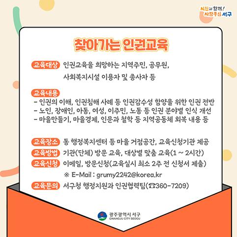 교육은 이달부터 연중 진행하고 있으며 사회복지시설을 비롯해 기관?단체, 인권 문제에 관심이 있는 지역 주민이라면 누구나 서구청 홈페이지에 있는 신청서를 내려받아 작성해 신청할 수 있다.