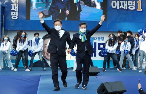 이재명 더불어민주당 대선후보와 김동연 전 경제부총리는 3일 합동 유세를 갖고 지지를 호소했다. 전격적인 야권 후보 단일화에 맞불 성격의 정치개혁 연대를 띄우며 동요하는 지지층을 다잡으려는 의도로 풀이된다.