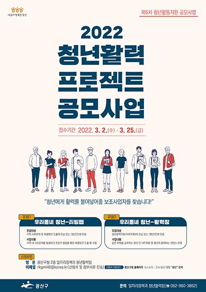 광주 광산구는 \'2022 청년 활력프로젝트\' 공모사업 에 참여할 청년 보조 사업자를 오는 25일까지 모집한다고 3일 밝혔다.