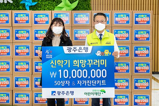 광주은행은 이번 행사를 통해 신학기를 맞이한 결손가정 청소년 50명에게 학용품 세트와 생활용품, 간식 등이 담긴 ‘신학기 희망꾸러미’ 50상자를 전달했다. 또 코로나19 자가진단키트 비용도 후원했다.