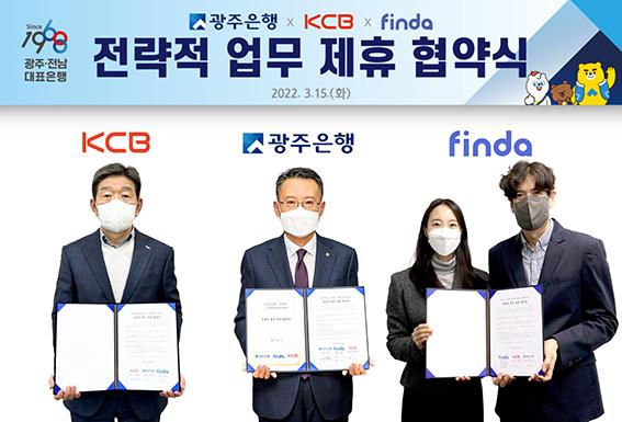 광주은행은 16일 신용평가사인 코리아크레딧뷰로㈜(KCB), 핀테크 기업인 ㈜핀다 등과 혁신금융서비스를 위한 전략적 업무 협약을 체결했다고 밝혔다.