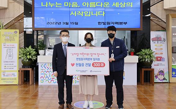 한국수력원자력㈜ 한빛원자력본부는 전날 직원들이 기부한 헌혈증 300매를 한국백혈병어린이재단 광주센터에 기증했다고 16일 밝혔다.