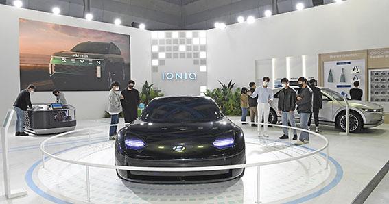 현대차는 \'아이오닉 브랜드 팬 파크\'를 주제로 전시 공간을 기획해 관람객들에게 전용 전기차 브랜드 아이오닉의 방향성을 알린다. 전시 공간은 아이오닉 존과 충전 콘텐츠 존으로 구성된다.