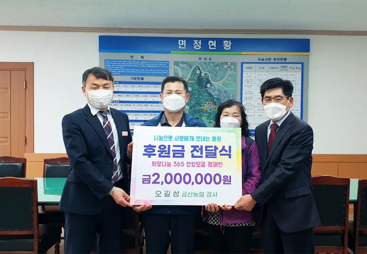 올해 공산농협 감사로 선출된 오 씨는 “감사 선출에 대한 고마움을 담아 후원금을 기탁하게 됐다”며 “희망나눔365 연합모금 정기후원자 등록과 더불어 어려운 이웃을 위한 봉사활동도 지속해가겠다”고 말했다.