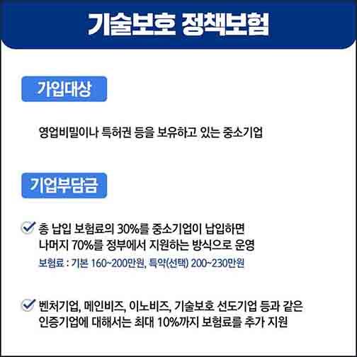 기술보호 보험의 가입대상은 영업비밀이나 특허권 등을 보유하고 있는 중소기업으로, 총 납입 보험료의 30%를 중소기업이 납입하면 나머지 70%를 정부에서 지원하는 방식으로 운영한다.