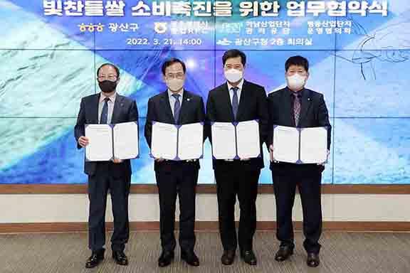 광주 광산구는 21일 구청 2층 상황실에서 광주통합RPC, 하남산업관리공단, 평동산단운영협의회와 ‘광주산 빛찬들쌀 소비촉진을 위한 업무협약’을 체결했다고 밝혔다.