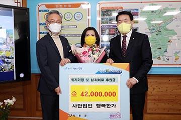 (사)행복한가은 지난 25일 장흥군 저소득 위기가정과 아동 심리치료 지원금으로 4200만 원을 후원했다.