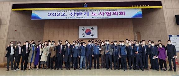 전남도교육청과 전국공무원노동조합교육청본부전남교육청지부가 28일 전남교육청 대회의실에서 노사 대표인 행정국장, 지부장을 비롯한 시·군 지역 노사 간부 60여 명이 참석한 가운데 \'2022 상반기 노사협의회\'를 가졌다.