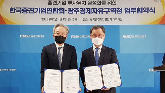 광주경제자유구역청(이하 광주경자청)이 한국중견기업연합회(이하 중견련)와 투자유치 활성화를 위한 업무협약(MOU)을 체결하고 핵심산업 분야 중견기업 투자유치에 주력한다.