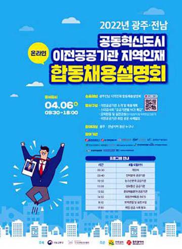 전남도는 6일 나주 전남도농업기술원 청년창농타운에서 \'2022년도 광주·전남 공동혁신도시 이전공공기관 지역인재 온라인 합동채용설명회\'를 개최한다고 3일 밝혔다.