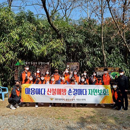 광산 의용소방대는 호남대학교 학생으로 꾸려진 대학생 의용소방대원들과 광산구 어등산 등산로 일대에서 경계 근무를 함께 하며 산불 예방 캠페인을 펼쳤다.