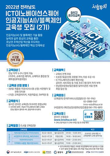 광양시가 전남 지역 인공지능(AI)과 블록체인 SW 인재를 양성하는 2022년 전남ICT이노베이션스퀘어 2기 교육생을 모집한다.