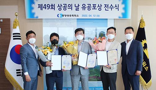 광양상공회의소는 ‘제49회 상공의 날 유공포상 전수식’을 지난 12일 개최하여 회원사 sk e&s(주) 국길호 상무에게 ‘국무총리 표창’을 (주)금풍공업 서정현 사장과 중앙이엠씨(주) 김운천 대리에게 ‘산업통상자원부장관 표창’을 전수했다.