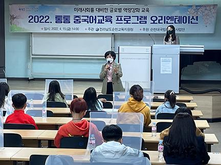 순천교육지원청은 지난 15일 순천대학교 인문예술대학 합동강의실에서 초·중학생, 학부모, 교사, 대학교수 등 100여 명이 참석한 가운데 \'2022년 통통 중국어교육 프로그램\' 오리엔테이션을 실시했다.