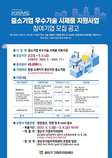 광주 광산구는 지역 중소기업을 대상으로 우수기술 시젝품 제작 지원사업을 추진한다고 밝혔다.