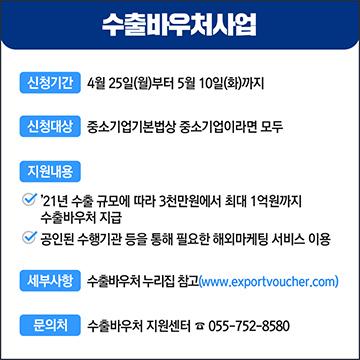 이번 2차 접수는 4월 25일부터 5월 10일까지 수출지원기반활용사업(수출바우처) 누리집(www.exportvoucher.com)을 통해 온라인으로 할 수 있으며, 세부적인 문의는 중기청 수출지원센터(062-360-9194)로 하면 된다.