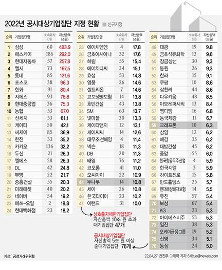 공정거래위원회(공정위)는 27일 정부세종청사에서 76개 기업집단을 공시대상기업집단으로 지정하고, 그중 자산총액 10조원 이상인 47개 집단을 상호출자제한기업집단으로 지정할 계획이라고 밝혔다. 지정일자는 다음달 1일이다.