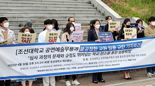조선대학교 공연예술무용과 임용 불공정 해결 대책위원회가 지난달 30일 개최한 \'불공정 교원 임용 규탄 기자회견\'.2022.05.11. /조선대학교 공연예술무용과 임용 불공정 해결 대책위원회