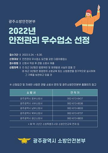 광주시 소방안전본부는 6월30일까지 자율안전관리 문화 정착을 위한 2022년 안전관리 우수 다중이용업소를 모집한다.