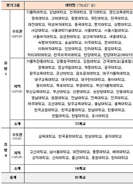 선정 결과 모든 대학이 참여할 수 있는 유형Ⅰ은 총 77개교를, 기존에 이 사업에 참여한 적 없던 대학을 선발하는 유형Ⅱ 사업에는 14개교를 최종 선정했다.