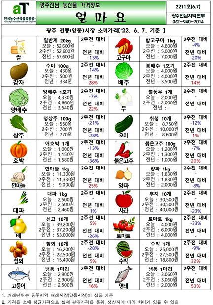 8일 한국농수산식품유통공사(aT) 광주전남지역본부가 제공한 농산물 알뜰장보기 가격정보 \'얼마요 2211호\'에 따르면, 전년 대비 가격이 크게 내린 품목은 애호박, 상추, 배 등이며, 가격이 오른 품목은 수박, 감자, 깐마늘 등이다.