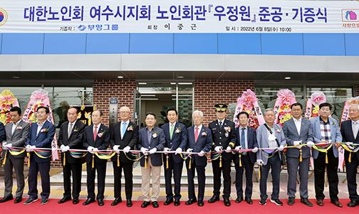 부영그룹은 8일 전남 여수시 노인들의 복지 증진을 위해 노인회관 \'우정원(宇庭園)\'을 신축해 대한노인회 여수시지회에 기부했다고 밝혔다.