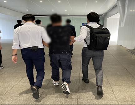 전남경찰이 베트남에서 검거한 전화금융사기(보이스피싱) 혐의 상선급 피의자를 인천국제공항을 통해 국내로 압송하고 있다. /전남경찰 제공