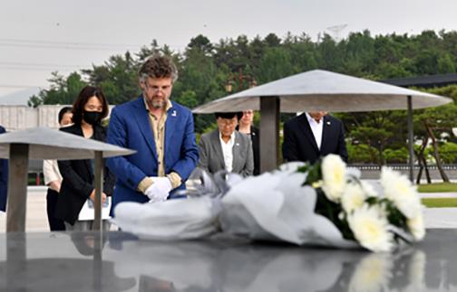 12일 오후 파비앙 살비올리 유엔 진실·정의·배상·재발 방지 특별보고관이 광주 북구 운정동 국립5·18민주묘지를 찾아 참배하고 있다.