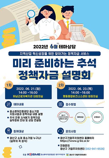 광산구 기업주치의센터가 ‘정책자금, 미리 준비합시다’를 주제로 지역 중소기업을 대상으로 6월 테마상담을 개최한다.