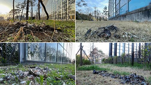 광주 지역 아파트 투명 방음벽에 부딪쳐 죽은 새 들의 사체. /성난비건 제공