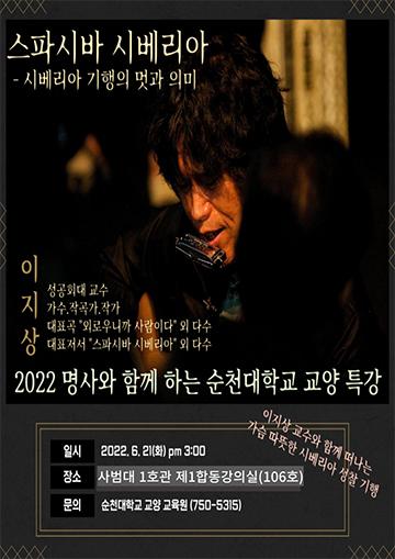 순천대 교육혁신본부 교양교육원이 주관하는 이번 특강에서는 지친 일상에 따뜻한 희망의 언어를 들려주는 가수 겸 작곡가로 활동 중인 이지상 교수가 ‘스파시바 시베리아: 시베리아 기행의 멋과 의미’를 주제로 강의에 나선다.