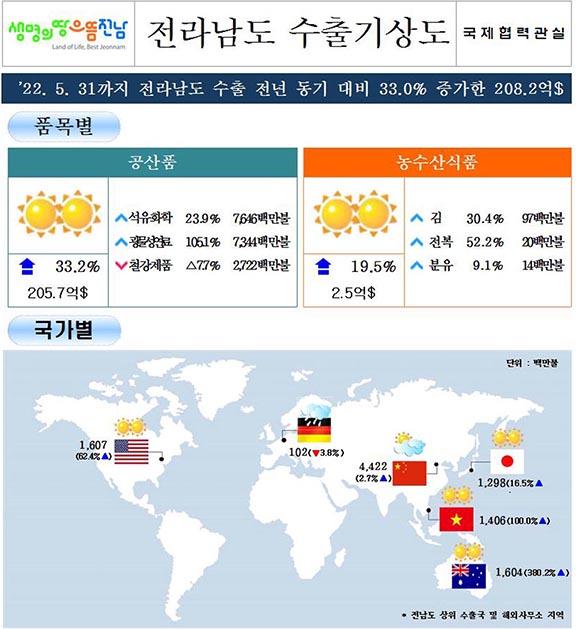 전남도는 올 5월까지 수출액이 전년 동기 대비 33.0% 증가한 208억 달러로 5월 누계 기준 역대 최고 실적을 달성했다고 22일 밝혔다. 이는 코로나19 이전인 지난 2019년 5월과 비교해도 49.4% 증가했다.