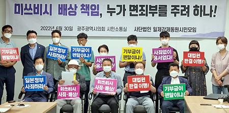 일제강제동원시민모임이 6월30일 오전 광주 서구 광주시의회 1층 시민소통실에서 기자회견을 열고 \"일본 전범기업의 사과·배상\"을 촉구하고 있다. /일제강제동원시민모임 제공