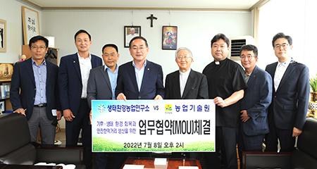 전남도농업기술원은 8일 천주교 광주대교구청에서 김희중 대주교 등 20여 명이 참석한 가운데 재단법인 생태환경농업연구소와 친생태환경적인 농업실천기술 개발과 확산을 위한 업무협약을 체결했다. (사진=전남도농업기술원 제공) 2022.07.11
