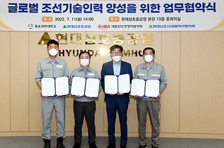 현대삼호중공업은 11일 회사 본관에서 김형관 대표이사와 목포과학대학교 이호균 총장, 현대삼호사내협력사협의회 김병수 회장, 대불산단경영자협의회 대아산업 황주석 사장 등이 참석한 가운데 \'글로벌 기술 인력 양성을 위한 업무 협약식\'을 가졌다고 12일 밝혔다.