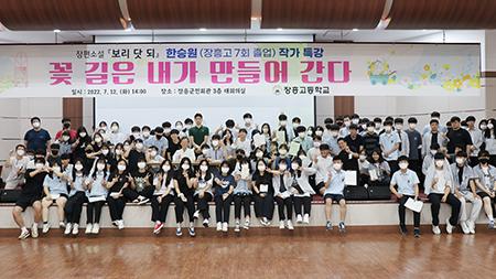 장흥고등학교가 12일 장흥군민회관에서 한승원 작가(장흥고 6회 졸업)를 초청하여 장흥고등학교 학생 352명이 참석한 가운데 \'꽃길은 내가 만든다\'를 주제로 특강을 진행했다고 밝혔다.