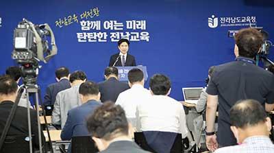 김대중 전남도교육감이 14일 청사 중회의실에서 취임 후 첫 기자회견을 갖고 주민직선 4기 전남교육의 정책 방향과 비전을 밝혔다.