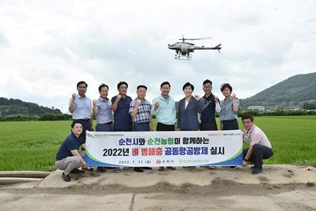 순천농협과 순천시는 협력해 벼 병해충 피해 최소화와 고령 농업인의 일손 부족을 해소하고, 고품질 쌀의 안정적인 생산을 위해 무인항공기를 활용한 공동 항공방제를 순천시 별량면부터 시작했다.
