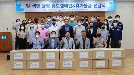 순천상공회의소는 지역기업체 대표 및 관계자 등 45명이 참석한 가운데,지난 18일 상의회관 5층 컨퍼런스 홀에서 사회적 거리두기 방역지침을 준수하면서 일·생활 균형 홍보 캠페인 및 하계휴가문화지원 물품 전달식을 개최했다.